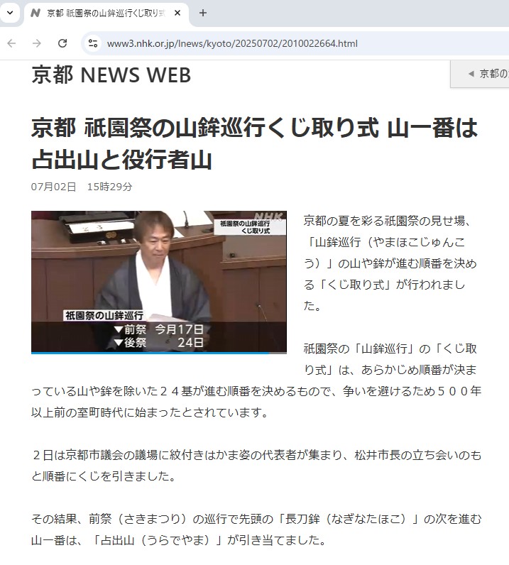 2025年7月2日、京都市役所の市議会議場にて、祇園祭・山鉾巡行の順番を決める伝統行事「くじ取り式」が行われました。